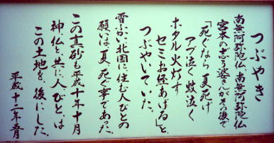 登山口の大日山の案内板の裏側には、真砂集落を引き払った方達のつぶやきがしたためてある。