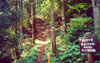 登山道はすぐに案外ときつい登りで、空は曇りがち、風は全くなく蒸し暑い。おかげで30分程